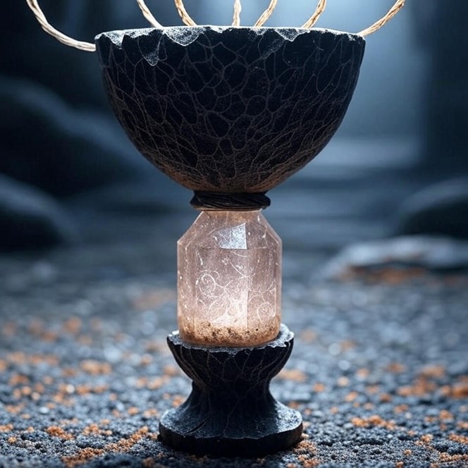 - Gust of Stone-Spirit Insight: Once per day, the wearer can hold the chalice and focus for 6 seconds, reciting a rhythmic chant to summon a controlled gust of wind carrying mineral dust. This gust affects a 10-foot radius, revealing hidden geological features or spirit-guided stone layers by highlighting them with a shimmering quartz haze, lasting for one minute, but risking disruption if interrupted.