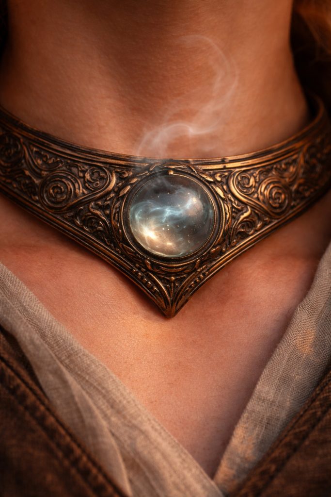 A narrow collar of heat-darkened bronze worn around the throat or upper chest, inset with a thumb-sized lens of imperfect blown glass. The glass swirls with faint internal striations, as if frozen breath were trapped within. When warm air passes over it, the lens glows faintly and vibrates almost imperceptibly.