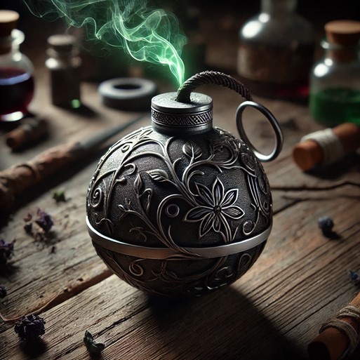 Use: The Poisoned Smoke Bomb, crafted from dried and powdered Grimroot, serves as a tactical tool to create chaos, confusion, and provide a distraction in various situations. When triggered, the smoke bomb releases a cloud of toxic fumes that can incapacitate or disorient anyone within its radius. This tool finds its utility in ambushes, escapes, or situations where the element of surprise and disarray are advantageous. Assassins, spies, or characters skilled in subterfuge and deception often employ the Poisoned Smoke Bomb to their advantage.