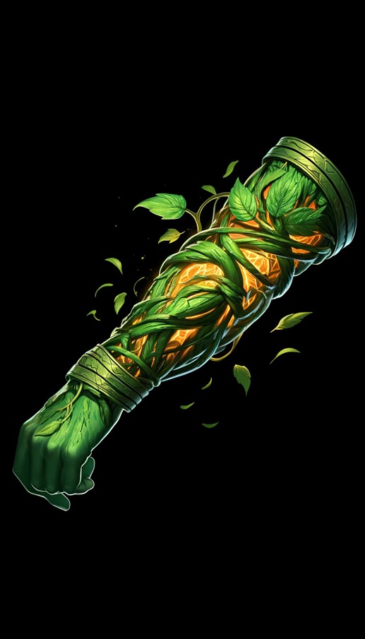 - Description: A vibrant green arm-worn artifact made of interwoven vines and leaves, with glowing amber veins. Covers from wrist to armpit.