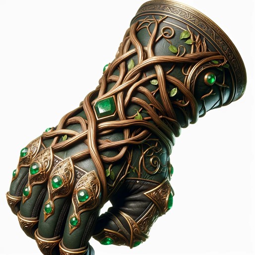 • Description: A gauntlet made from dark green leather with gold patterns and small emeralds, providing a mystical bond with nature.