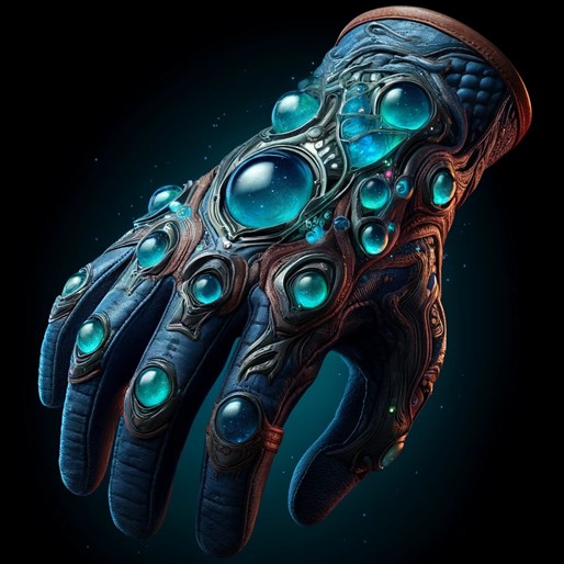 Appearance: The gauntlet is a striking deep blue with iridescent patterns that shift colors depending on the light, mimicking the chameleon-like creatures of the unknown lands. Embedded within the leather are small, luminescent crystals that pulse with a gentle, otherworldly light. The inner lining is made from the soft hide of an alien beast, providing comfort and a snug fit.