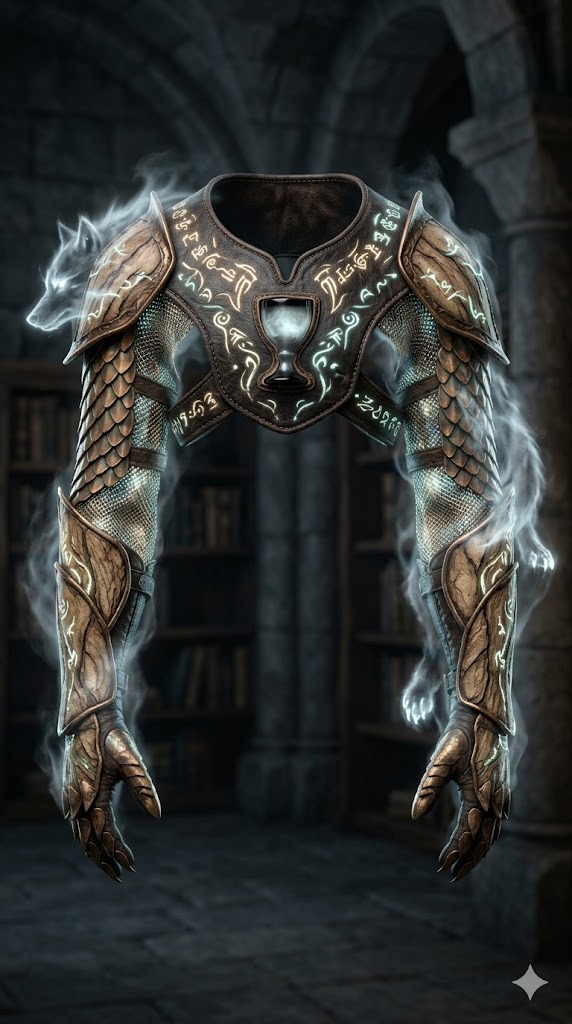 This Tier 4 artifact manifests as a pair of integrated, full-arm gauntlets that extend from the fingertips up to the shoulders, connected across the upper back by a heavy leather yoke. The “bracer” sections are crafted from river-bronze scales that seem to ripple like water, while the “tome” has become a series of articulated, bark-parchment plates that slide over the forearms. At the center of the chest yoke rests an obsidian chalice-shaped gem that glows with a pale, misty silver light. When the wearer speaks, glowing sigils from the Syllable of Becoming race across the leather and bronze, and a faint, ethereal mist—carrying the silhouette of a silver wolf—clings to the arms like a living shroud.