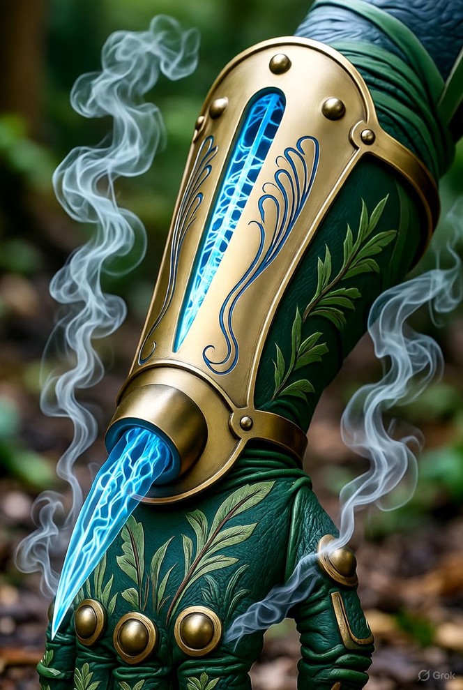 Description: A sleek, curved brass bracer encircling the trunk (or arm), forged from lightweight alloy with river-droplet rivets and a razor-sharp fang-blade protruding from the primary nozzle. Adjustable crystal-tipped vents line its length, etched with glowing Vo-Run circuits pulsing blue near water, wrapped in supple green-dyed leather blending jungle flora motifs. The fang’s pulsating glow merges with steam bursts, forming venom-laced whips. Worn as a single gauntlet, it hums with feral precision, emitting scents of wild earth, oiled brass, and faint venom-mist, its frame sturdy yet agile for Nga-Tara trunks or adapted limbs.