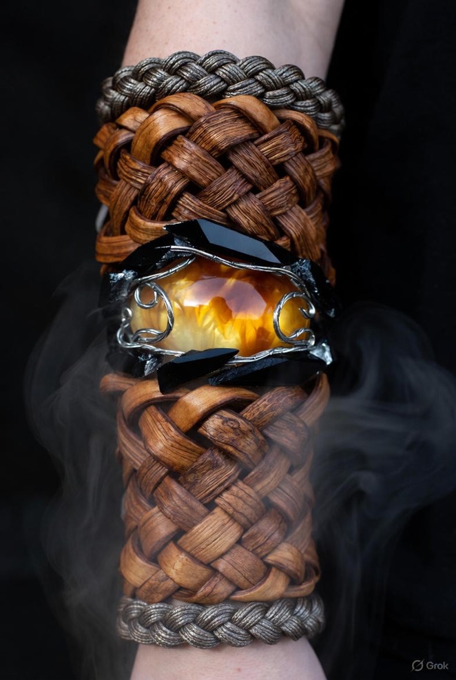Description: Sleek forearm bracers of interwoven umbralite and polished alder, crowned by braided voidsilt cord framing the wrists like a vital band. Razor-edged obsidian shards encircle a pulsing amber core, now laced with faint silver magical filigree and hearth-runes that glow shadowy-amber alongside the shadow circuits. A secretion pod at the inner grip releases invigorating mist to supple the skin and stir focus, while the weave-limbs bear etched moonstone spirals. The whole thrums faintly with shadowy harmony, its cloak seeking not only secure shades but hearth-echoes in stone and bough, allowing wielders to traverse veils of dark, lethargy, and hidden peril like shadow-woven spirits.