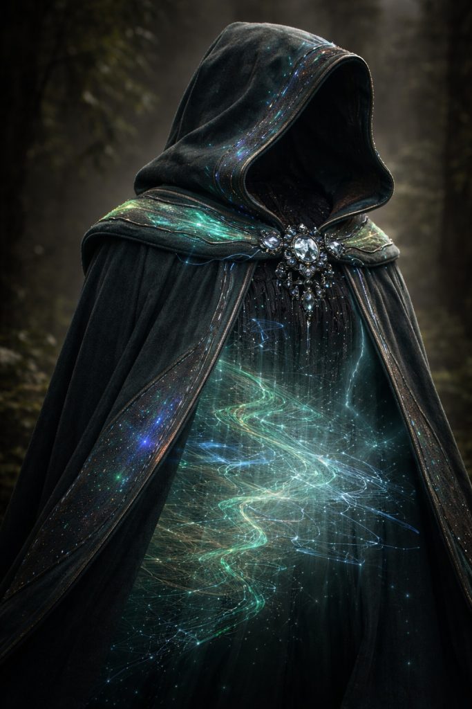 Defense: When pursued through dense woodland, the wearer draws the cloak tight and allows the prismatic leyglass filaments to synchronize with the forest’s ambient flow. Shadows bend unnaturally, paths subtly misalign, and the holographic ley-map reveals animal trails, root-vaults, and ruin hollows that do not appear on mundane maps. The wearer vanishes not by speed, but by misdirection, leading threats into looping paths, dead ground, or spiritually “quiet” spaces where pursuit falters.