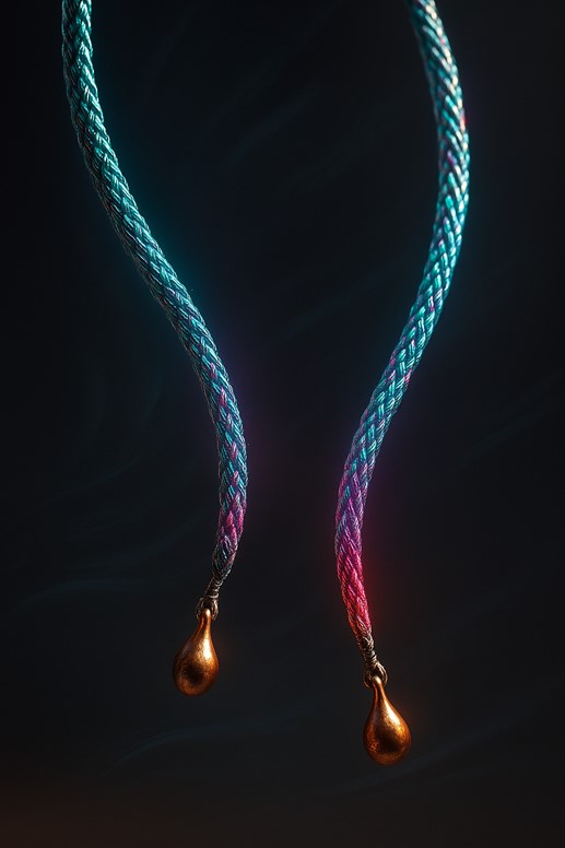 Physical Description: Two threadlike cords, each three inches long, braided from moon-silver spider silk interlaced with translucent shards of pale aqua dawn-glass. Tiny copper weights, no heavier than raindrops, dangle at the tips. In sun or lantern-glow the cords shimmer sea-green with ripples of warm rose hue where glass meets silk. When the wearer moves, the weights swing in rhythmic counterpoint, drawing faint arcs of light.