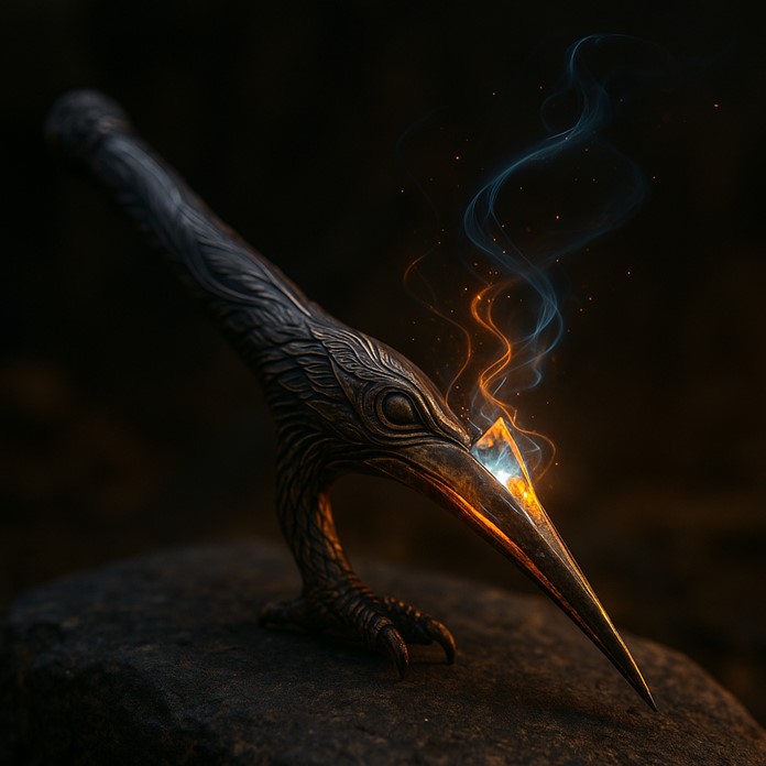 Defense: In crowded urban alleys, the wielder uses walls to reflect sound. A sharp tap of the beak creates misleading echo corridors, making pursuers hear footsteps behind them when the wielder has already ascended a wall. If cornered, a vertical sonic burst collapses crates and market stalls, forming debris barriers.