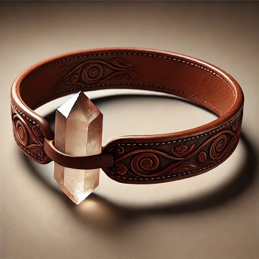 Color: The leather of the headband varies in shades of earthy brown, and the quartz crystal emits a faint, warm glow.