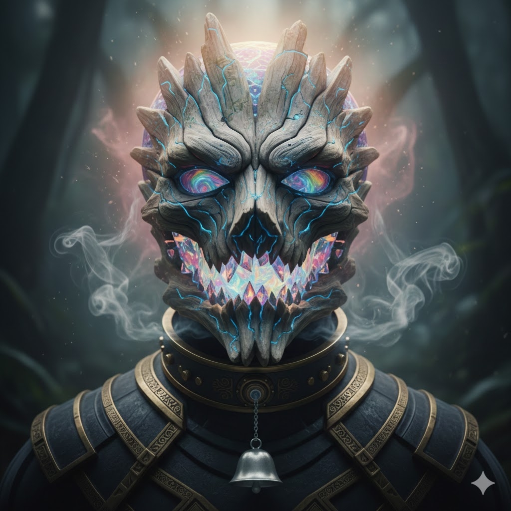 Description: This Tier 5 artifact is a masterwork of integrated design. It takes the form of an intricate, full-face cowl-mask that extends down to a reinforced brass collar. The lower portion is crafted from grey, rippling Malagan driftwood that pulses with blue bioluminescent veins. Embedded within the “maw” of the mask are crystalline shards that shimmer with iridescent liquid, while a small, silver-white bell—the clapperless Empath’s Chime—hangs delicately from the throat. Layered obsidian plates and etched brass vents wrap around the neck and shoulders, exhaling a constant, cool silver vapor that smells of petrichor and ozone. The entire surface shifts color and texture to mimic the environment, yet glows with a soft, dawn-sky nimbus when its power is focused.