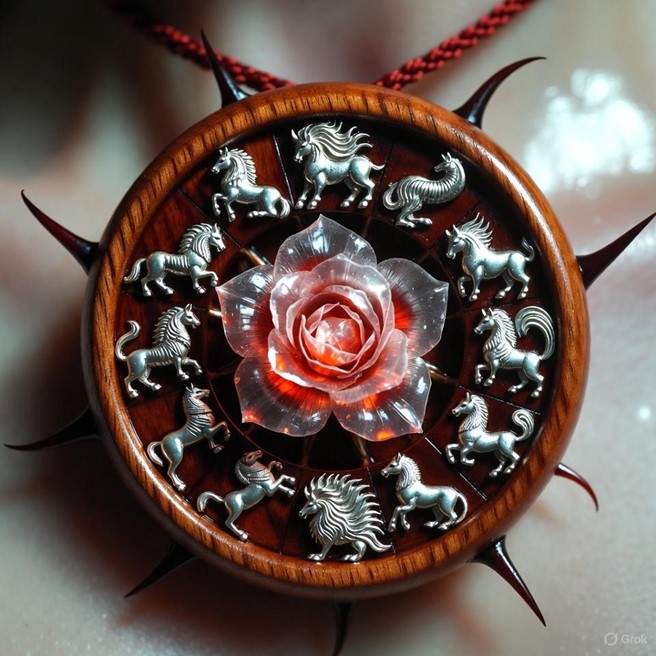 Description: A palm-sized cherry-wood disc the colour of old blood, perfectly round and warm to the touch. At its heart, a living ruby rose blooms eternally, its five petals formed of translucent crimson ice-fire. Around the rim, the twelve zodiac animals are carved in flowing silver that shifts like living thread. Five dark, thorn-like needles protrude from the back, curling gently to rest against the wearer’s skin when clasped at the throat by a thin cord of braided red silk and nightshade fibre. When held to the light, faint dew-like flames bead along the thorns; when closed, it resembles an ornate wooden brooch hiding lethal beauty.