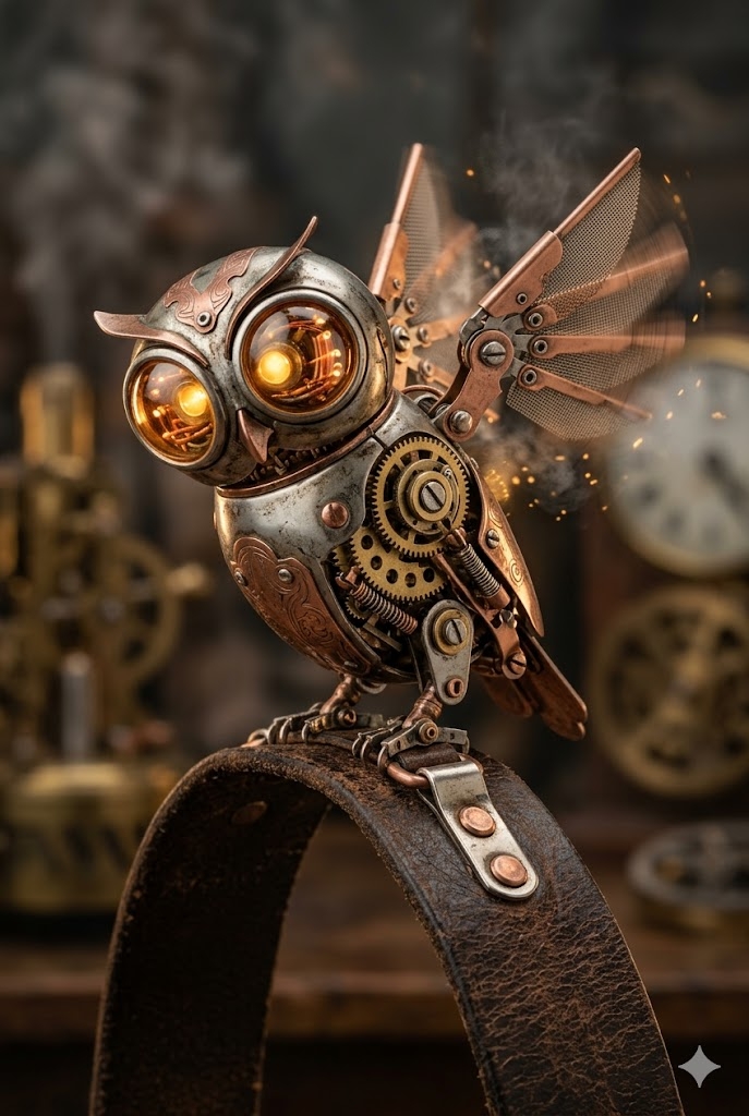 - Sight: The wearer looks remarkably caffeinated and unstable. Their eyes dart in sync with the owl’s amber lenses. The Sentinel itself is a blur of vibrating copper wings and spinning gears, occasionally emitting tiny sparks of amber static.