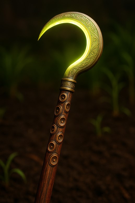 - Flavor: The crook faintly hums when near healthy crops, or pulses coldly when disease lingers in the soil.