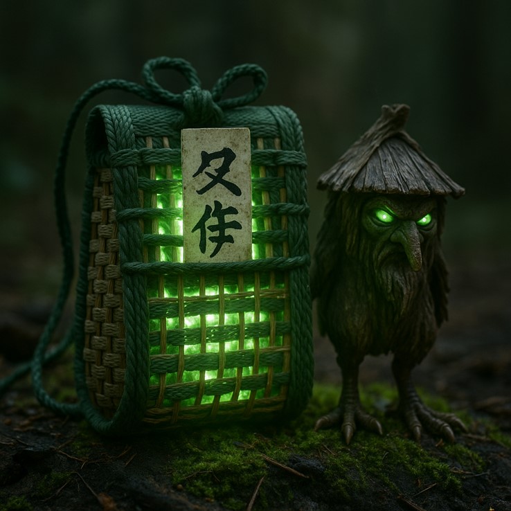A pouch woven of bamboo fibers and green silk, its surface etched with dark runes and accented by tiny carvings of chicken legs along the seams. When opened, the glow of Ofuda shines faintly within, and an eerie whispering rises, as though the construct of the hut waits within to be called forth. Hanging at a belt or sash, it feels like a strange union of reverent serenity and wild witchcraft.