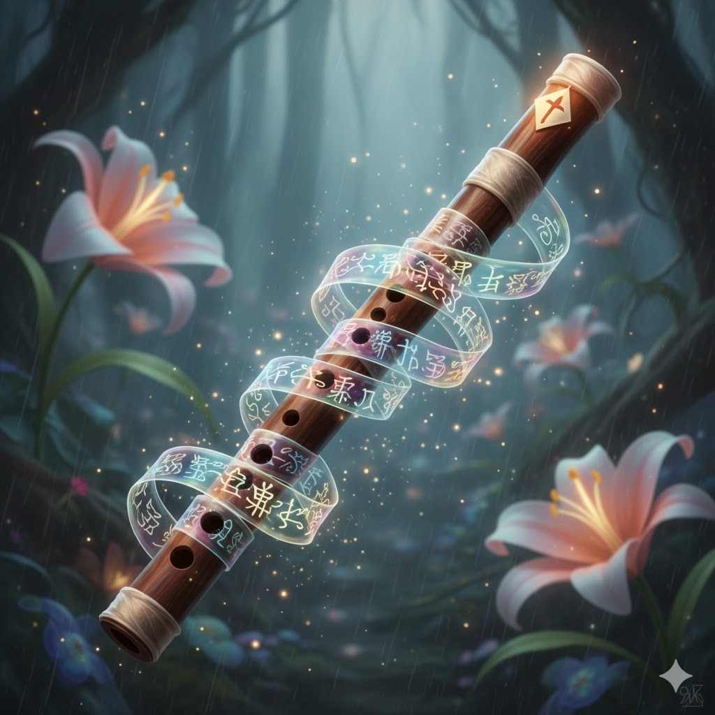This artifact appears as an exquisite flute of dark, polished heartwood, but its surface is not bare. Wrapped tightly around the length of the wood are translucent, silken parchment scripts that glow with shifting, iridescent patterns. Affixed to the head of the flute is a pulsing paper talisman (Ofuda) that emits a soft, amber light and a scent of rain-washed lilies. When held, the item vibrates with a faint, rhythmic heartbeat, and small motes of starlight drift from the finger holes. It is a single, unified tool that functions as a bridge between performance, nature, and emotional insight.