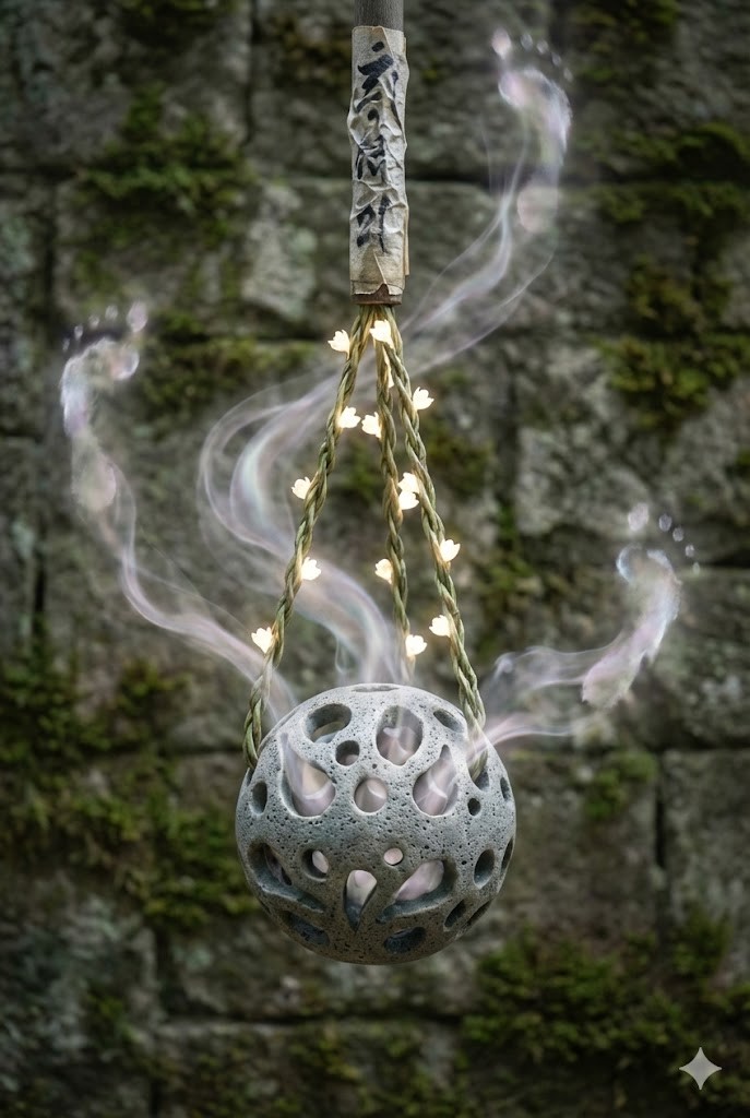 Description: The Censer of the 88th Drifting Path appears as a perforated sphere carved from a single chunk of porous Zephyrstone. It hangs from a chain made of braided Luminous Blossom stems. The handle is wrapped tightly in the weathered, shifting paper of the Ofuda 21, the ink constantly crawling across the surface like ants. The Censer does not burn coal; it boils a limitless supply of “Ghost-Vapor”—a swirling, pearlescent mist that smells of ozone, old paper, and lavender. When swung, it leaves trails of nonexistent footprints in the air.