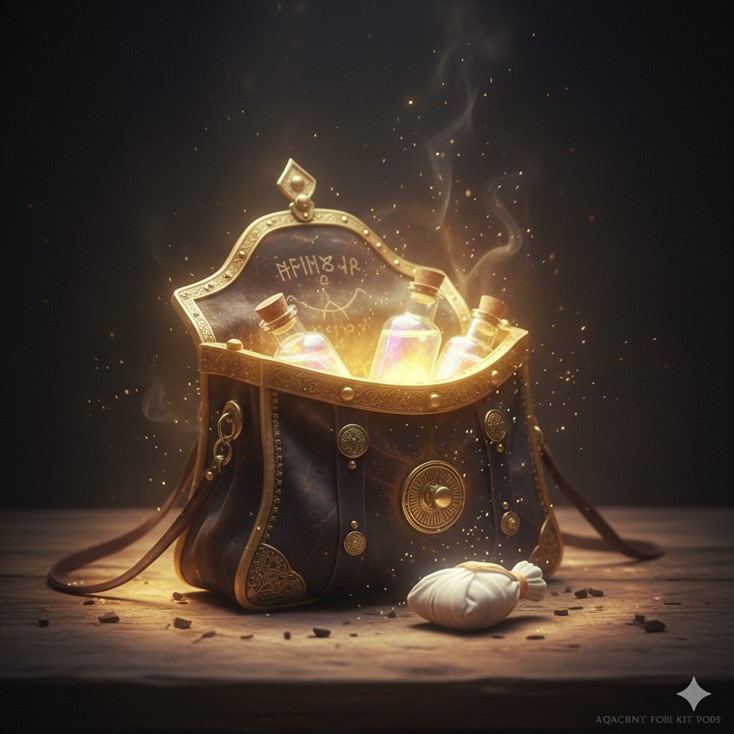 • Active Re-consecration: A character can perform a complex ritual to repair the kit directly. This requires access to an alchemical laboratory and proficiency in both Alchemy and Ritual Magic. The process involves carefully stitching the physical satchel with silver thread while simultaneously performing a ritual of purification, using rare reagents like a vial of holy water, powdered pearls, and the essence of a truth-serum. A successful skill check at the end of the ritual will restore 4d10 Item HP. If the item is silenced at 0 HP, this active ritual is the only way to reawaken the spirit and restore it to a functional state.