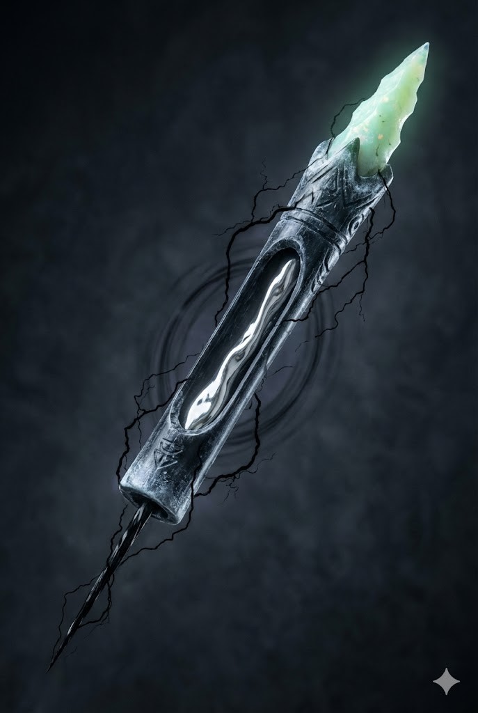 Description: The weapon appears as a 18-inch hollow spike carved from the light-absorbing black bone of a corrupted Thunderbird. It functions simultaneously as a balanced dagger, a precise blowgun, and a surgical syringe. The tip is a jagged, hypodermic barb made of Ancestral Lancet jade and opal, glowing with a sickly, pale-green bioluminescence. Inside the hollow bone shaft, liquid silver (the “Time-Thread”) flows suspended in a magnetic field of shadow magic. When swung, it leaves a trail of black static in the air; when fired, it projects needles of solidified shadow-lightning. It feels freezing cold to the touch and smells of ozone and antiseptic.