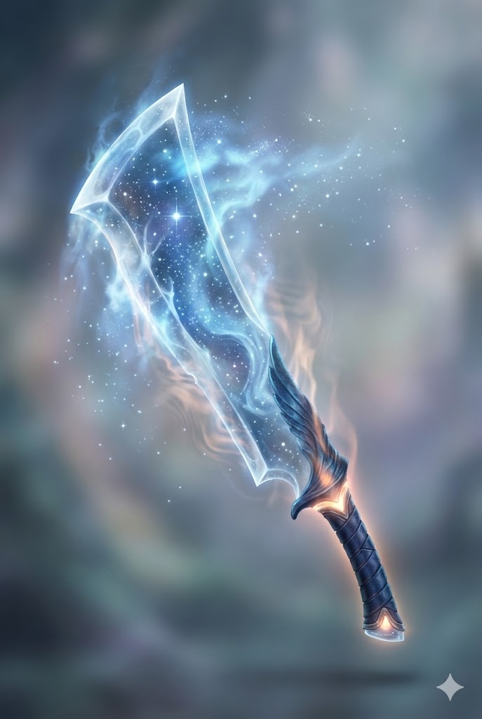 Description: At first glance, this appears to be a colossal Dream-steel cleaver, easily five feet long, with a spine thick enough to serve as an anvil. However, the steel is translucent and shimmering, swirling with internal starlight and liquid moonlight. The hilt is wrapped in midnight-blue griffon leather that feels warm and pulses gently. Instead of being heavy, the weapon drifts slightly in the hand, tugging upward as if trying to return to the sky. When swung, it leaves a trail of glowing blue steam and sparkling stardust. The blade edge does not just cut; it ripples the air, creating distortions that look like heat haze over water.
