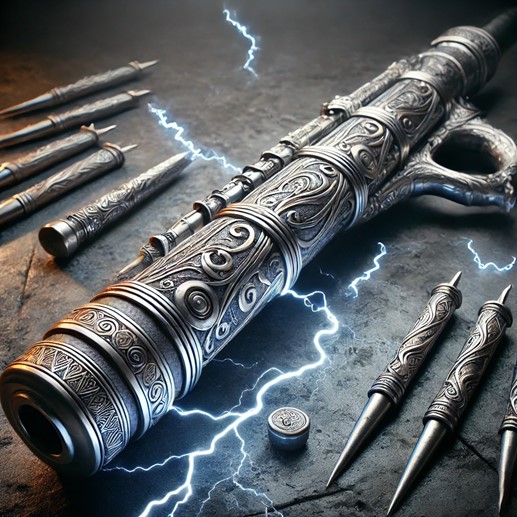 - Sight: From a distance, the blowgun seems to glow with an otherworldly light. Faint arcs of electricity dance across its surface, and when a dart is fired, a sudden flash of lightning illuminates the surroundings, briefly casting sharp shadows. The wielder appears to command the very storm, surrounded by a faint aura of energy that hints at the blowgun’s magical properties.