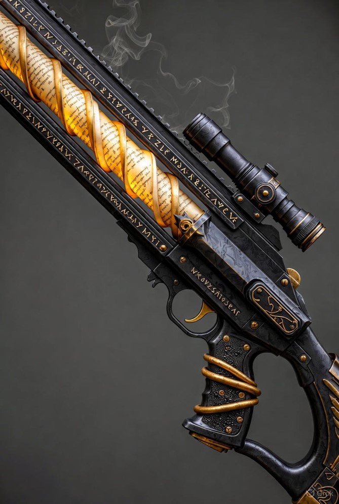 Description: A hybrid artifact: a heavy shadowsteel carbine with a spiraling golden-scripture barrel, tendril-wrapped stock, and crystalline book-breech. It fires alchemical parable-charges that erupt in divine thunder, blending demolition force with revelatory insight.