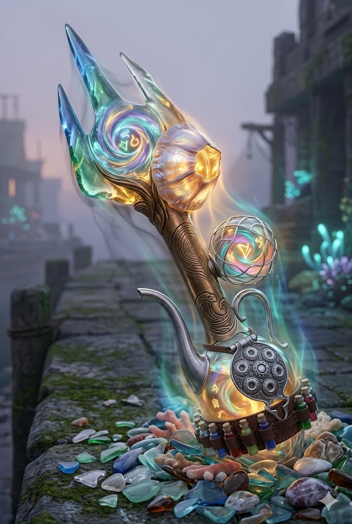 Description: A single physical object consisting of a long shaft of enchanted sea glass that transitions seamlessly into a three-pronged trident head. Clamped permanently onto the base of the center prong is a large, iridescent mother-of-pearl barnacle that pulses with a warm, amber-gold light. The grip of the weapon is made of sun-warmed amber resin that carries the faint scent of woodsmoke and salt. When held, the sea glass shimmers with an internal golden mist, and a low, melodic hum—reminiscent of a lullaby—vibrates through the shaft.