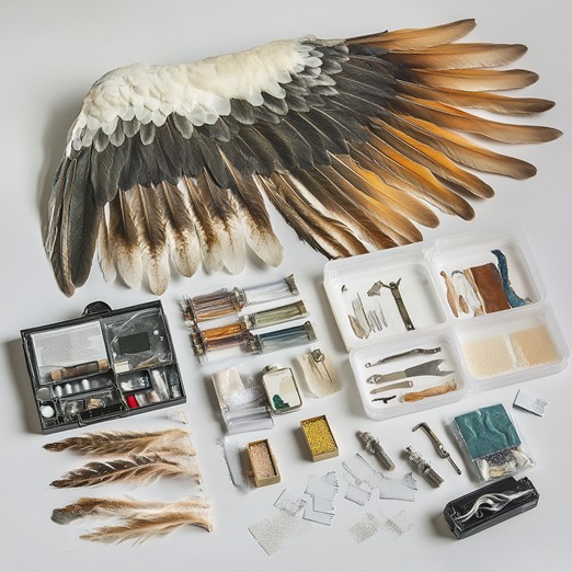 When Dracoraptoris’ wings sustain minor tears or punctures, the adhesive patches in the kit can be used to seal the damaged areas, preventing further tearing and maintaining the integrity of the wing membrane. In the case of fractures or breaks, miniature clamps provide stabilization, allowing Dracoraptoris to continue flying while minimizing additional damage. Additionally, the kit contains extra feathers that can be used to replace any damaged or lost feathers, ensuring the wing’s structure and aerodynamic capabilities remain optimal.