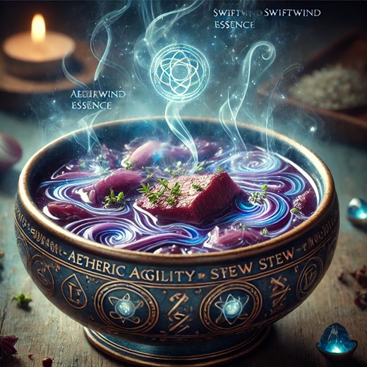 Lore: In the realm of arcane cuisine, Aetheric Agility Stew holds a special place. Its recipe is said to have been first concocted by an ancient order of mystic hunters who traversed treacherous landscapes and sought to harness the power of the aether. Legends tell of a wise sorcerer named Arvandir who discovered a sacred grove where the Swiftwind Herb, imbued with the essence of the aether, grew in abundance. With his profound understanding of magic and culinary arts, Arvandir created the Aetheric Agility Stew to provide his comrades with heightened agility and nimbleness during their perilous quests.