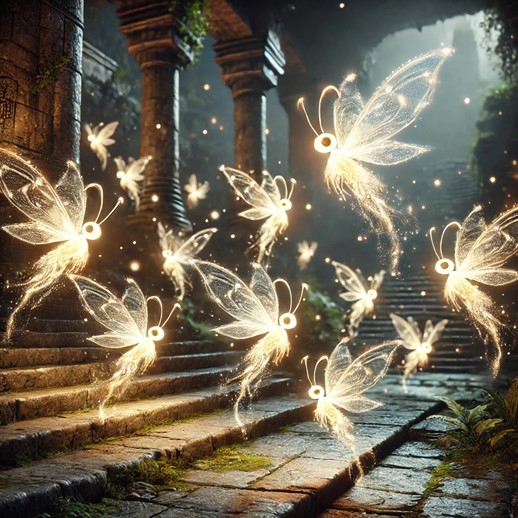 The Luminsprites, they flitted about the dark halls and hidden corners of the dungeon, leaving trails of glowing light in their wake. They played tricks on the weary travelers, leading them astray with their light or guiding them to hidden treasures, depending on their whim. The people of the time spoke of the Luminsprites with both fondness and frustration, for their tricks could be both helpful and hindering.