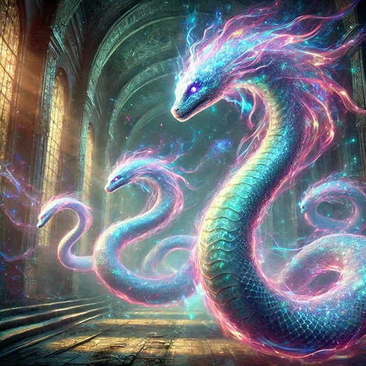 - Description: The Phantasmal Serpents are seen as shimmering, semi-translucent creatures with iridescent scales that constantly shift and change colors. They move through the air with a fluid, serpentine grace, creating an almost hypnotic effect.