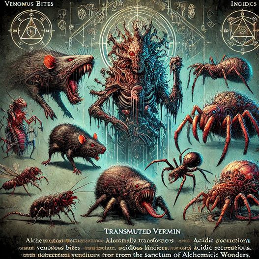 - Alchemical Manipulation: Some transmuted vermin possess the ability to manipulate their surroundings through alchemical means, such as creating temporary barriers or disorienting opponents with alchemical fumes.