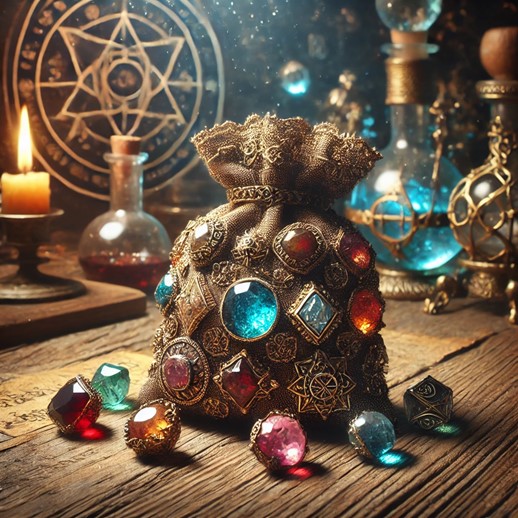Use: The Bag of Multifaceted Gems serves as a portable repository of magical enchantments. Each gem within the bag is imbued with a distinct magical property, capable of temporarily enhancing weapons or armor. When a gem is affixed to an item, it imparts its magical properties to the object, providing temporary enchantments such as increased damage, improved accuracy, elemental damage, or defensive enhancements. The gems can be easily removed and reused, allowing for flexibility in adapting to different combat situations or equipping multiple items with temporary enchantments.