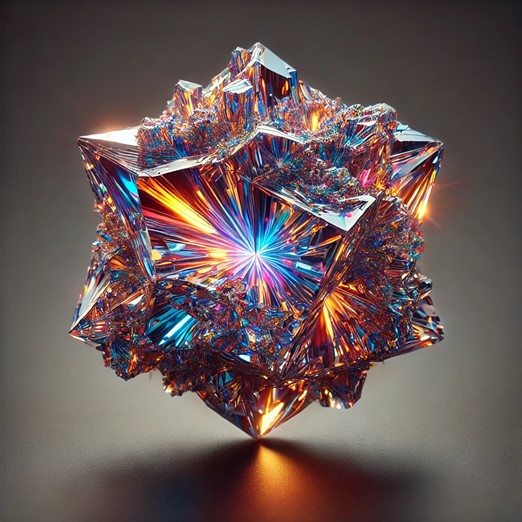 - Description: A small crystal with multifaceted surfaces reflecting different hues, pulsating with chaotic vitality.