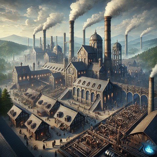 Environment and Appearance: Located on the outskirts of a bustling city, the Aethersteel Foundry sits against a backdrop of rolling hills and lush forests. The factory itself is a sprawling complex made of a mix of stone and timber, blending the architectural styles of the Middle Ages and Renaissance. Tall chimneys rise into the sky, releasing puffs of smoke that carry the faint glow of Aether.