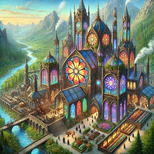 Appearance: EmpathForge itself is a sprawling structure made of a harmonious blend of wood, stone, and metal. The building’s design reflects both medieval and Renaissance architectural styles, with tall, pointed towers, decorative flourishes, and large arched doorways. Stained glass windows depicting scenes of unity and compassion adorn the walls, bathing the interior in a warm, colorful glow.