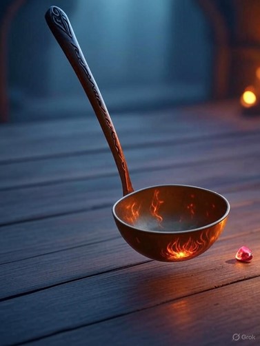- Description: A medium-sized ladle with a brass bowl and a cedar handle, engraved with flame motifs along the handle’s length. A small ruby shard is embedded at the handle’s base, glowing with a warm red light. The ladle’s bowl has a faint fiery sheen, and its cedar handle emits a subtle cedar scent, enhancing its magical aura.