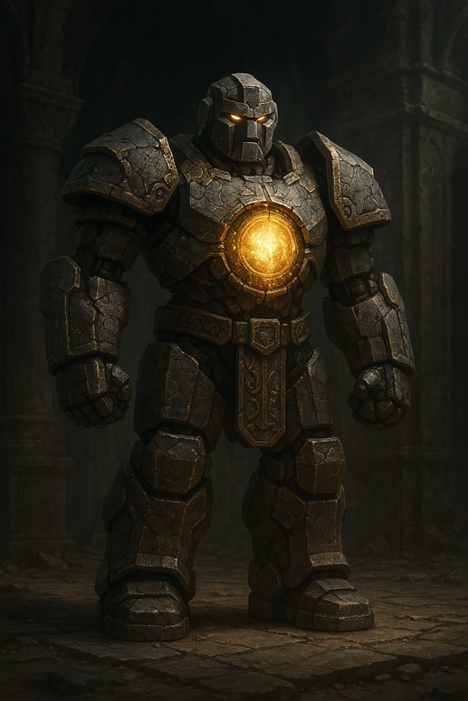 - Sight: From afar, the golem shudders, then lifts from stillness in a cascade of shifting plates and glowing seams. Light bursts from its chest and eye sockets in arcs of magic that cast massive, flickering shadows. Its fists clench with slow deliberation as dust lifts from the floor around it.
