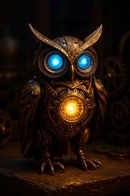 - User’s Perspective: The moment the Mechanical Familiar awakens, a faint vibration runs through its frame, like the first heartbeat of something newly alive. A series of soft clicks and whirrs echo within its metal casing as gears interlock and energy courses through its core. The air hums with the subtle presence of magic, an unseen force merging with intricate clockwork. The familiar’s eyes, be they polished lenses or glowing orbs, flicker briefly before settling into a steady light. Movements are fluid yet precise, an elegant blend of mechanical efficiency and arcane guidance. A faint warmth emanates from its core, not from heat, but from the quiet pulse of sustained energy.