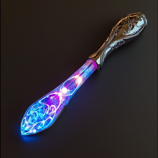 - Description: A 10-inch rod of Celestial Steel with three glowing Resonant Crystals (amethyst, sapphire, rose quartz) pulsing purple, blue, and magenta. It manipulates sound waves with arcane precision when used with a musical instrument.