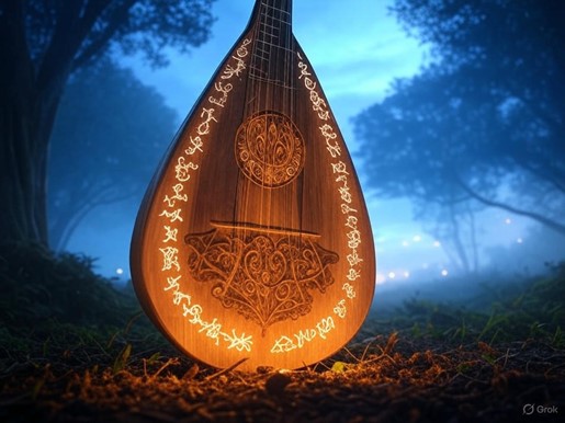 • Form: A lute crafted from pale, organic wood that shimmers with a faint bioluminescence. Its surface is etched with intricate patterns that glow softly when played, and its strings hum with a resonance that feels almost alive.