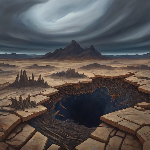 And so was born the Chasm of Lost Echoes, a wound that would never heal. A bottomless pit spewing forth not smoke nor molten rock, but the desolate silence of oblivion. For such was the power unleashed that this place became a threshold unto that which is not, a bleeding edge of existence.