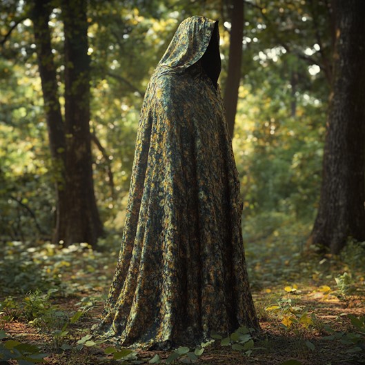 The Maker observed this shifting cloth and a thought came to him, as thoughts do. “This fabric,” he spoke, or perhaps only thought loudly, “it desires not to be seen plainly. It wishes to hide. I shall aid it.” And so, with needle and thread – thread perhaps spun from spider silk and enchantments – he fashioned a wide mantle, simple in cut but wondrous in substance. He laid spells upon it, spells of seeing and un-seeing. The intent was thus: whosoever wore this mantle, the cloth would gaze upon the place around it – be it rough stone wall, or deep forest green, or the bright banners of a feast hall – and it would take that appearance onto itself. The wearer, standing still, would seem to vanish, becoming as the wall, or the tree, or the tapestry behind them. A powerful aid, he thought, for those who must move like shadows, for the scout, the spy, the person wishing fervently not to be noticed.