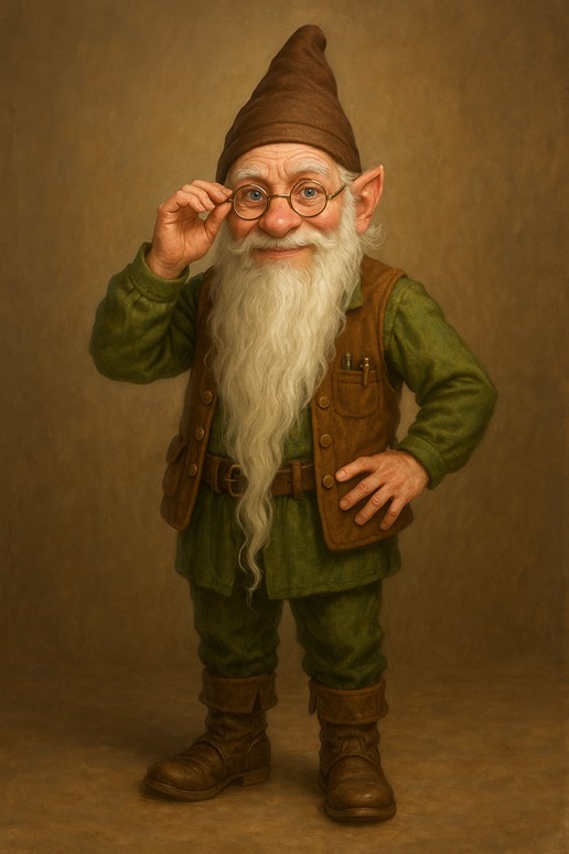 Appearance: Mavros is a small, sprightly gnome with a neatly groomed white beard that reaches down to his knees. His eyes are a bright shade of blue, always twinkling with intelligence and curiosity. He wears a pair of round spectacles, perched precariously on the tip of his nose, which he often has to push back into place with a nimble finger. He dresses in a mix of earthy greens and browns, with a vest adorned with pockets to store small trinkets and a pair of sturdy boots, suitable for exploring the world.