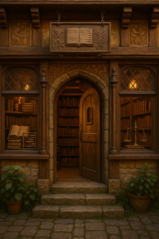 Shop’s Allure and Appearance: The Ledger’s Haven is a charming, two-story building made of warm, honey-colored wood, adorned with intricate carvings that depict scenes of ancient accountants and scribes at work. The exterior is welcoming, with a hanging sign that bears the shop’s name in elegant calligraphy, accented with golden ink. The entrance is a beautiful arched door, and above it, a small bell jingles merrily as customers step inside.