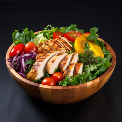 - Description: A lush green bed of salad leaves, adorned with bursts of reds, yellows, and whites from various other vegetables, topped with succulent pieces of grilled chicken.