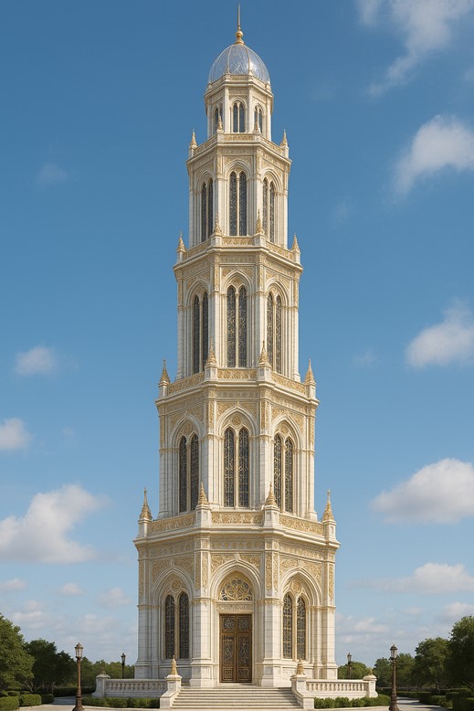 Appearance: The Echelon Spire is a majestic tower constructed primarily from white marble and adorned with intricate golden filigree. Its design combines elements of classic architecture with ornate detailing, reflecting both the city’s historical significance and its financial prominence. The tower is crowned with a glistening crystal dome that catches the sunlight, creating a beacon visible from miles away.