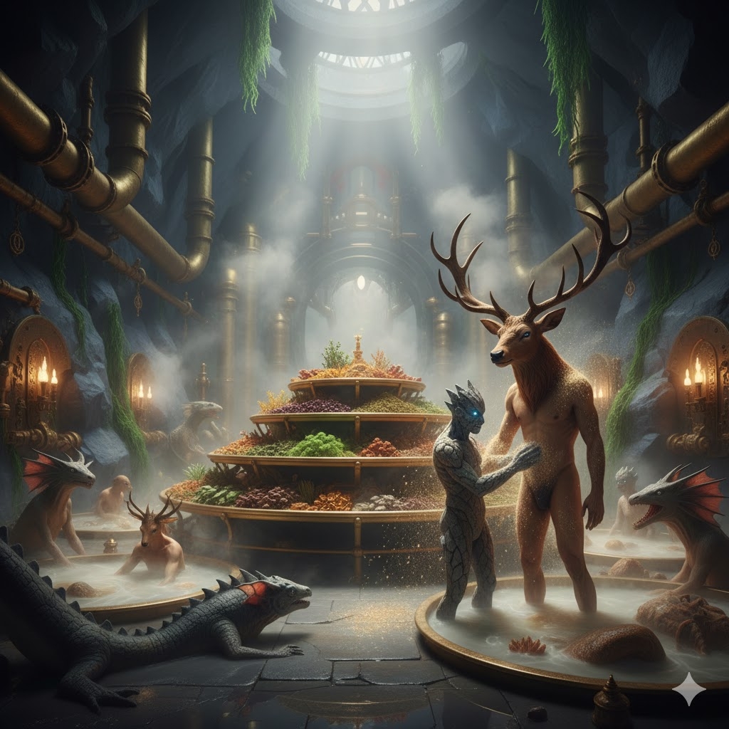 - The Upper Pools: Kept at a steady 38°C, these pools are for intensive physical therapy. The high salinity allows even the heaviest avatars, such as stone-gestalts or large beasts, to float effortlessly, removing all weight from their “achy” limbs.