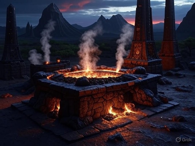 • Variations: Coastal Flamecitadels incorporate tidal steam for enhanced rituals, while mountain Flamecitadels use geothermal vents. Plains temples harness ash currents, with altars that resonate with the volcano’s rhythm.