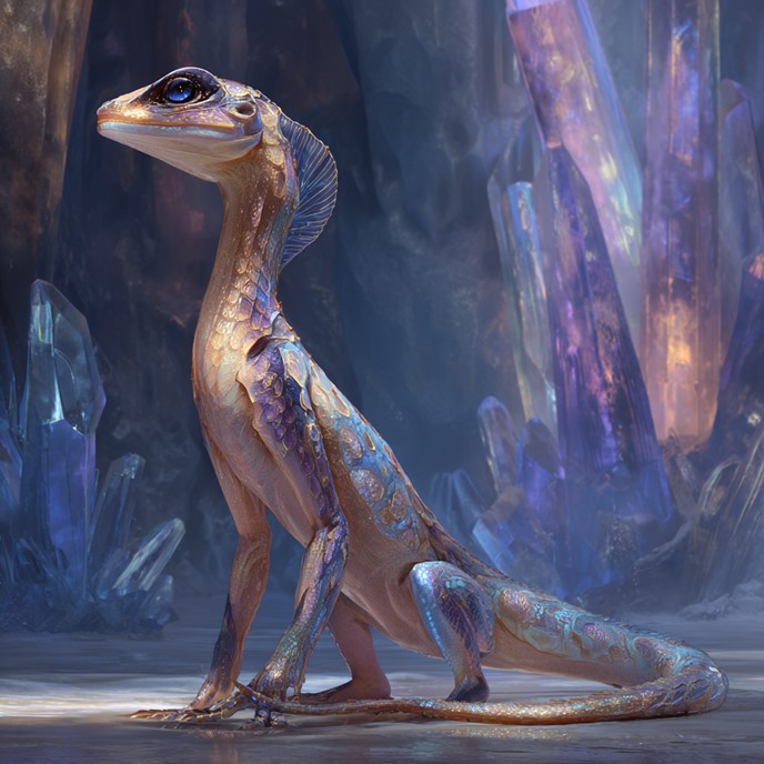 Tags: Aureate, Reptilian, Heliothermic, Iridescent, Color-Shifting, Luminous, Cavern-Dweller, Crystal-Dweller, Artist, Performer, Graceful, Crested, Light-Worshipper, Aurignacian, Expanded Spectrum Vision, Legacy-Keeper, Core-Crystal Dependent