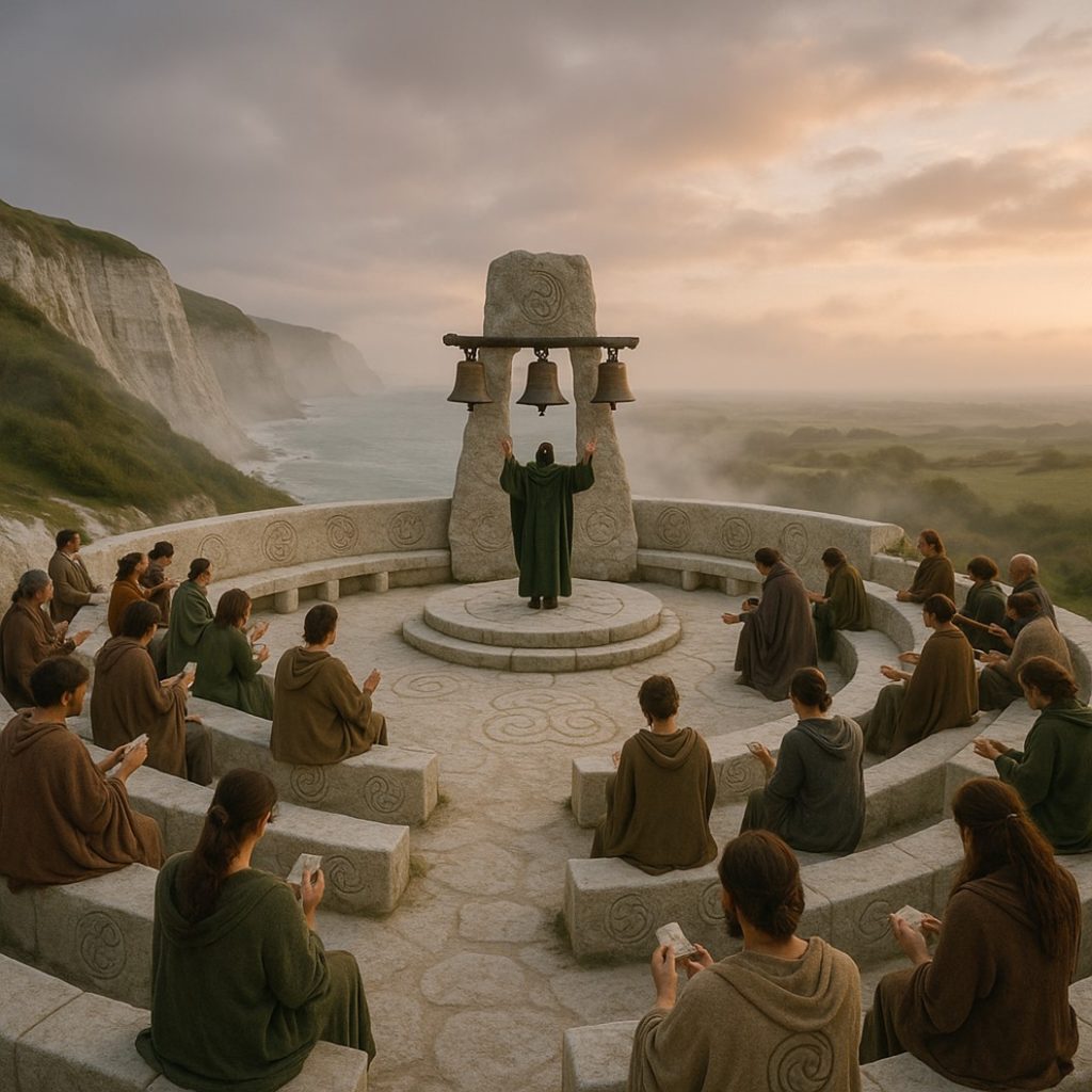 Key symbols appear everywhere: chalk triskelions carved above door lintels; braided rope bracelets dyed in three shades of sea-foam; small brass tuning forks tuned to the interval Dorset scholars call “second returning,” which vibrate when struck near unfinished work. High clergy wield staffs tipped with conjoined triple bells, their clappers bound in kelp to keep tones soft and overlapping.